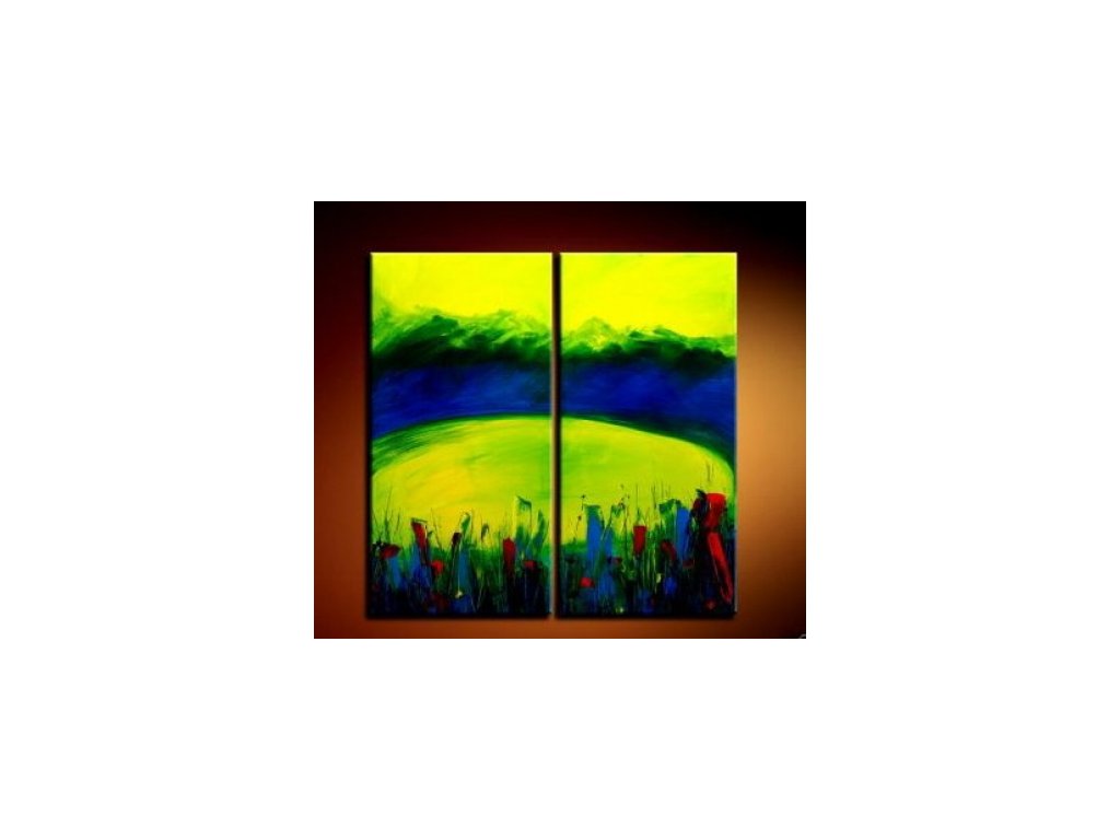 2x 40x80cm Dvoudílný ručně malovaný obrazový set. Abstraktní obraz je malován v jasných zelenožlutých barvách, vkusně doplněných tmavomodrou. Obraz je malován olejovými barvami na plátno, vypnuté na dřevěný blind rám s vypínacími klínky.