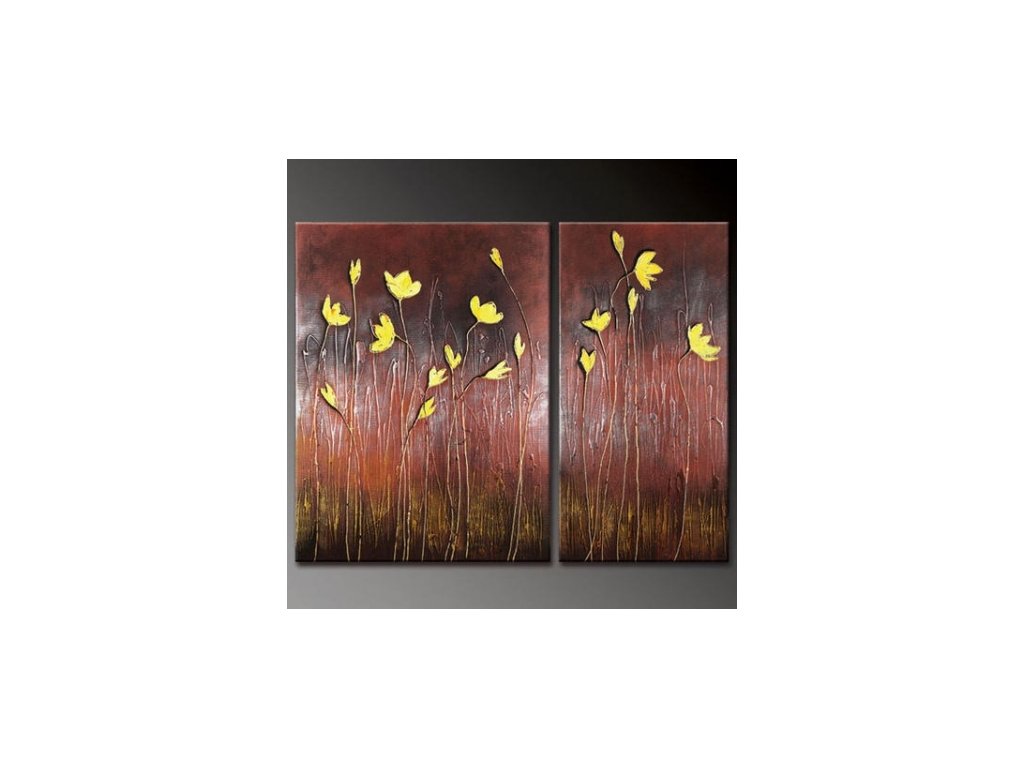 , 40x80cm Dvoudílný ručně malovaný obraz s motivem žlutých květinek výrazně vystupujících z tmavého pozadí. Obrazový set je malován olejovými barvami na plátno, vypnuté na dřevěný blind rám s vypínacími klínky.